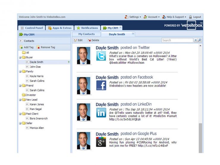 Monitor your clients and prospects social media conversations brilliantly with website CRM. Facebook, Twitter and LinkedIn are supported.